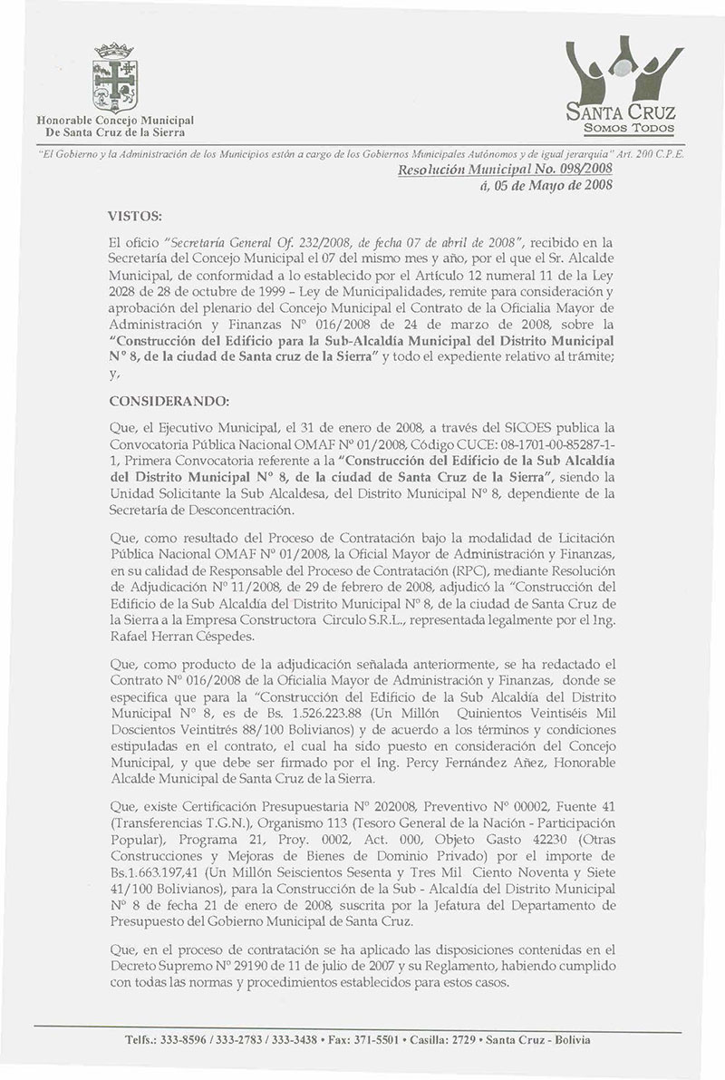 Aprueba el Contrato de la Oficialia Mayor de Administración y Finanzas Nº 016/2008, de 24 de marzo de 2008, por el monto de Bs. 1.526.223,88 (Un Millón Quinientos Veintiséis Mil Doscientos Veintitrés 88/100 Bolivianos), para la “Construcción del Edificio de la Sub Alcaldía del Distrito Municipal Nº 8, de la ciudad de Santa Cruz de la Sierra”, adjudicado a la Empresa Constructora Circulo S.R.L.