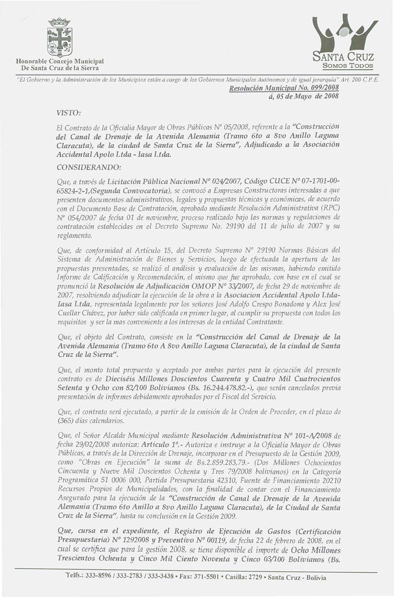 Aprueba el Contrato de la Oficialia Mayor de Obras Públicas Nº 05/2008, referente a la “Construcción del Canal de Drenaje de la Avenida Alemania (Tramo 6to A 8vo Anillo Laguna Claracuta), de la ciudad de Santa Cruz de la Sierra”, Adjudicado a la Asociación Accidental Apolo Ltda - Iasa Ltda, siendo que para la presente gestión 2008 esta asignado el importe Bs. 13.385.195.03.- (Trece Millones Trescientos Ochenta y Cinco Mil Ciento Noventa y Cinco 03/100 Bolivianos).