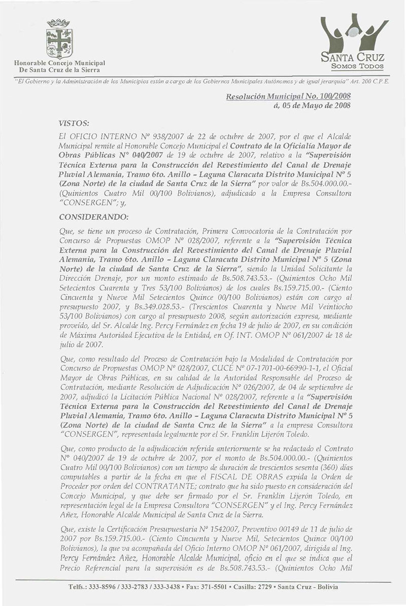 Aprueba el contrato de la Oficialía Mayor de Obras Públicas N° 040/2007 de 19 de octubre de 2007, por el valor de Bs. 504.000.00.- (Quinientos Cuatro Mil 00/100 Bolivianos), relativo a la “Supervisión Técnica Externa para la Construcción del Revestimiento del Canal de Drenaje Pluvial Alemania, Tramo 6to. Anillo – Laguna Claracuta Distrito Municipal Nº 5 (Zona Norte) de la ciudad de Santa Cruz de la Sierra”, adjudicado a la Empresa Consultora “CONSERGEN”.