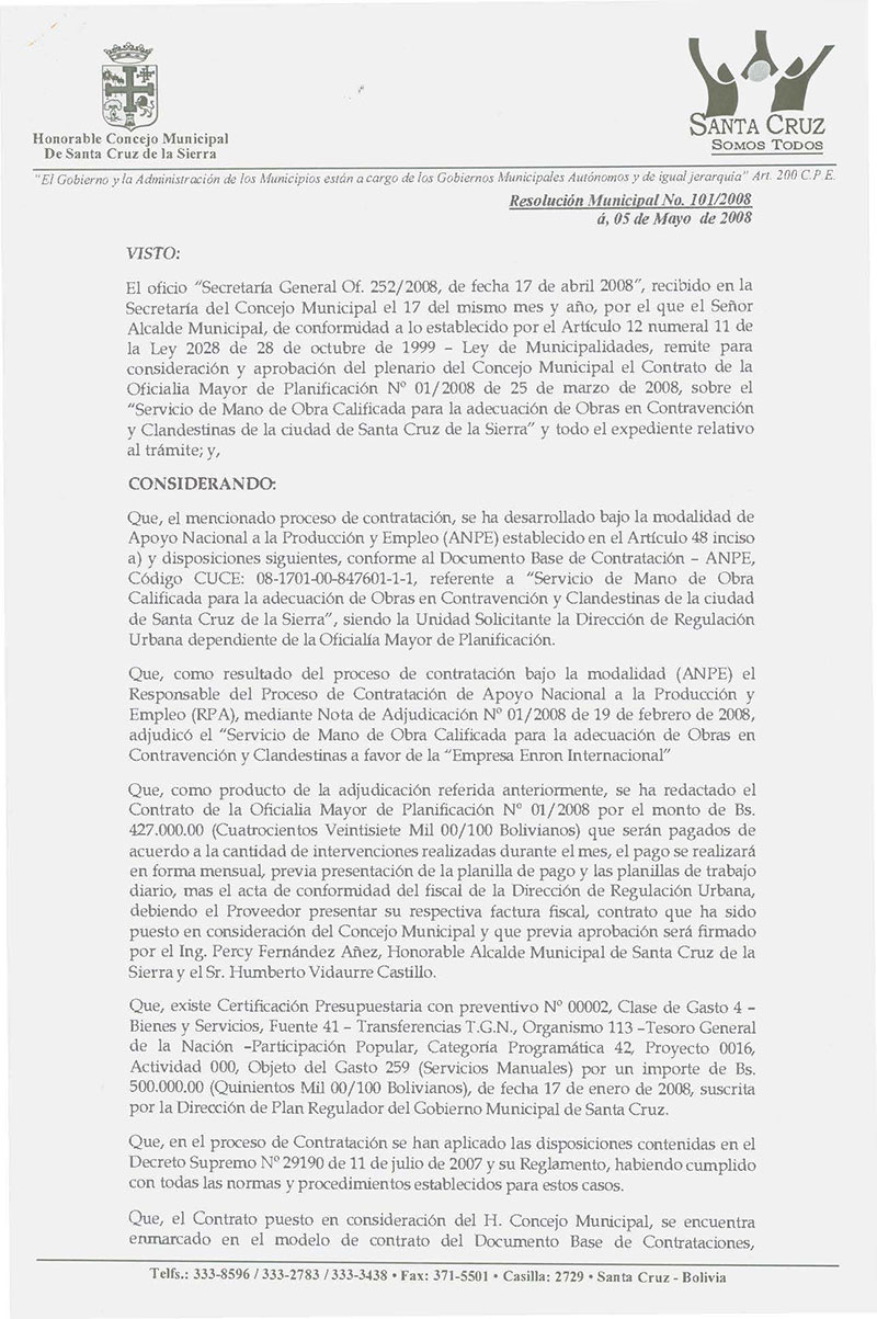 Aprueba el Contrato de la Oficialia Mayor de Planificación Nº 01/2008 de 25 de marzo de 2008, por el valor de Bs. 427.000.00 (Cuatrocientos Veintisiete Mil 00/100 Bolivianos), para el “Servicio de Mano de Obra Calificada para la adecuación de Obras en Contravención y Clandestinas de la ciudad de Santa Cruz de la Sierra” adjudicado a la “Empresa Enron”.