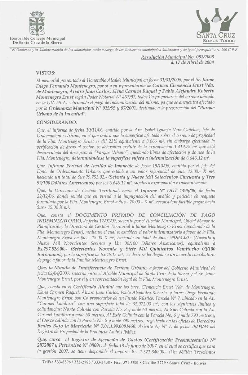 Aprueba el contrato de Transferencia del Terreno Urbano Ubicado en la U.V. 55-A, expropiado de la Familia Montenegro Ernst a través de Ordenanzas Municipales Nº 035/95 y 087/2001, destinado al “Parque Urbano de la Juventud”, suscrito entre el Gobierno Municipal de Santa Cruz de la Sierra y Jaime Diego Fernando Montenegro Ernest.