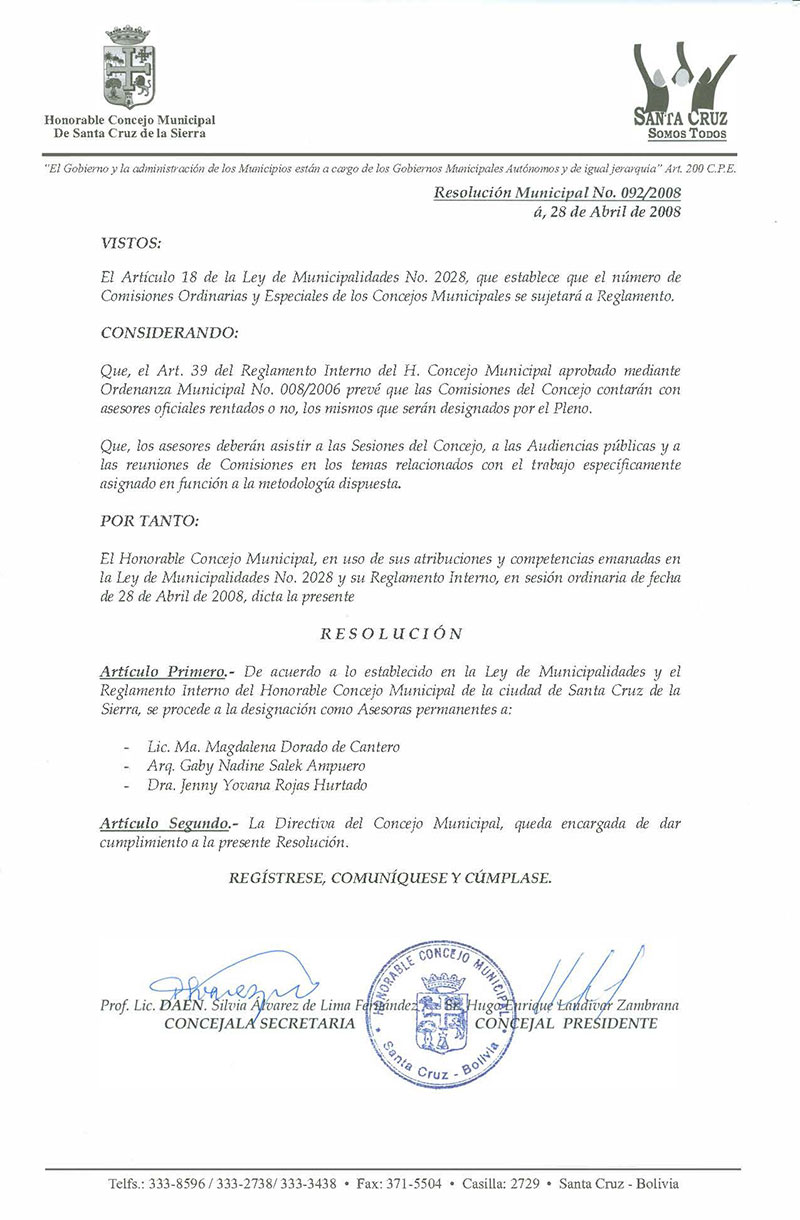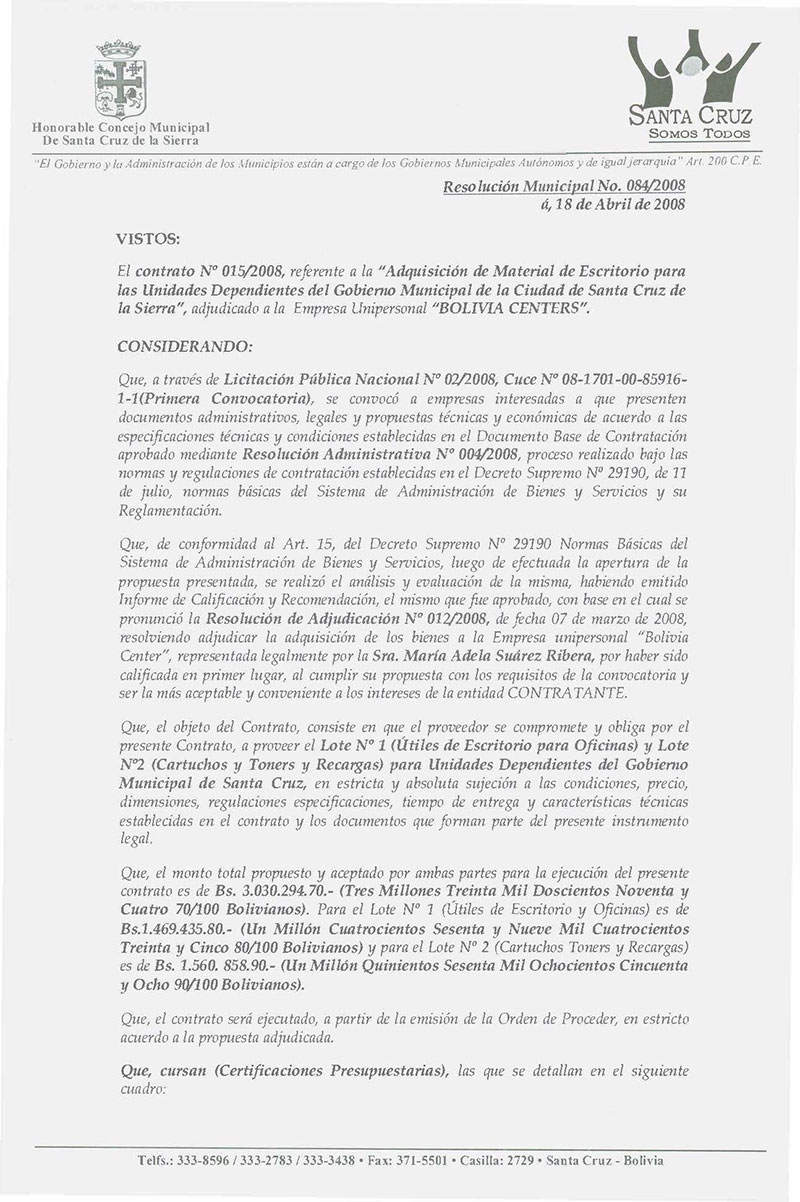 Aprueba el contrato Nº 015/2008, referente a la “Adquisición de Material de Escritorio para las Unidades Dependientes del Gobierno Municipal de la Ciudad de Santa Cruz de la Sierra”, adjudicado a la Empresa unipersonal “Bolivia Centers”, por un monto de Bs. 3.030.294.70.- (Tres Millones Treinta Mil Doscientos Noventa y Cuatro 70/100 Bolivianos).