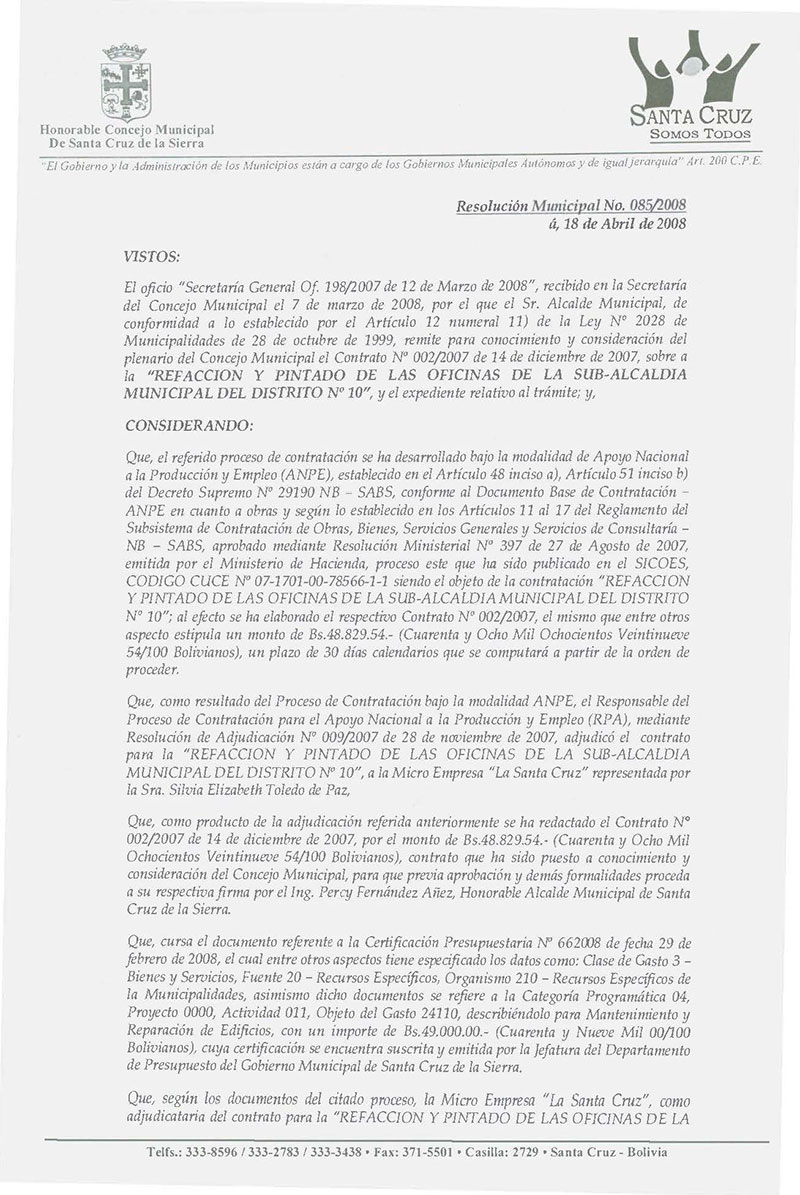 Aprueba el Contrato Nº 002/2007 de 14 de diciembre de 2007, por el monto de Bs. 48.829.54.- (Cuarenta y Ocho Mil Ochocientos Veintinueve 54/100 Bolivianos), para la “REFACCIÓN Y PINTADO DE LAS OFICINAS DE LA SUB-ALCALDÍA MUNICIPAL DEL DISTRITO Nº 10”, adjudicado a la Micro Empresa “La Santa Cruz”.