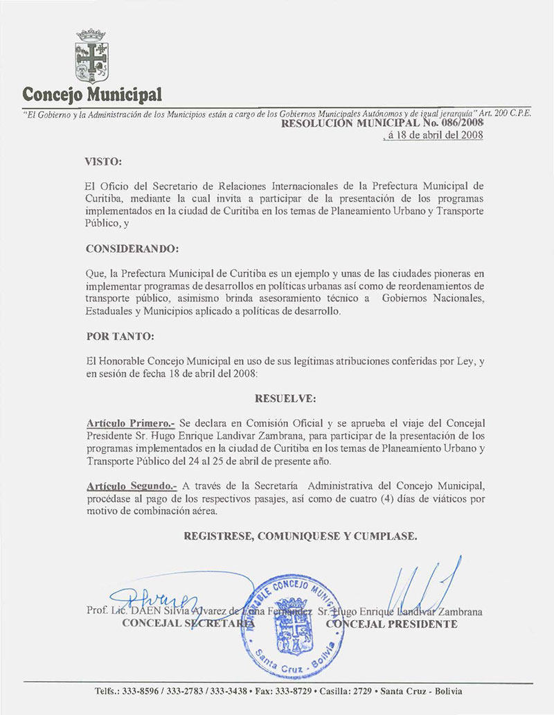 Declara en Comisión Oficial y aprueba el viaje del Concejal Presidente Sr. Hugo Enrique Landivar Zambrana, para partcipar de la presentación de los programas implementados en la ciudad de Curitiba en los temas del Planeamiento Urbano y Transporte Público del 24 al 25 de abril del presente año.