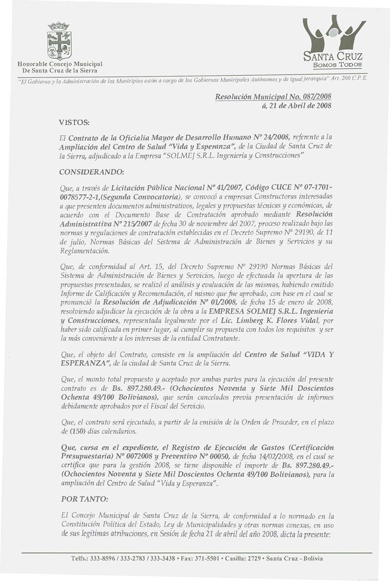 Aprueba el Contrato de la Oficialía Mayor de Desarrollo Humano Nº 24/2008, referente a la “Ampliación del Centro de Salud “Vida y Esperanza” de la Ciudad de Santa Cruz de la Sierra”, por un monto mensual de Bs. 897.280.49.- (Ochocientos Noventa y Siete Mil Doscientos Ochenta 49/100 Bolivianos), adjudicado a la Empresa “SOLMEJ S.R.L. Ingenieria y Construcciones”.