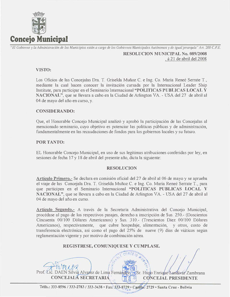 Declara en Comisión Oficial y se aprueba el viaje de las Concejalas Dra. Griselda Muñoz e Ing. María Rene Serrate para que participen en el Seminario Internacional POLÍTICAS PÚBLICAS LOCAL Y NACIONAL, que se llevará a cabo en la ciudad de Arlington VA - USA del 27 de abril al 04 de mayo del año en curso.