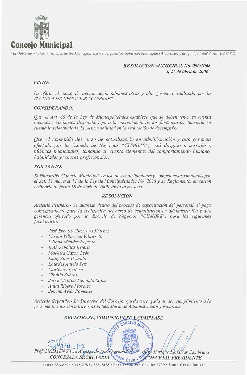 Se autoriza dentro del proceso de capacitación del personal, el pago correspondiente para la realización del curso de actualización en administración y alta gerencia ofertado por la Escuela de Negocios CUMBRE para los sigueintes funcionarios: Josë Ernesto Guerrero Jimenez, Miriam Villarroel Villarreta, Liliana Méndez Negrete, Ruth Zeballos Rivera, Modesta Cazon León, Leidy Siles Ovando, Lourdes Antelo Paz, Marlene Aguilera, Cinthia Suarez, Jorge Meliton Taboada Rojas, Anita Ribera Morales y Jimena Ävila Pommier.