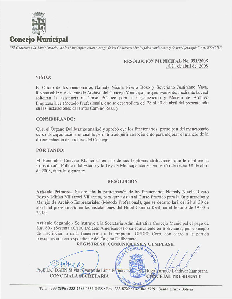 Aprueba la participación de las funcionarias Nathaly Nicole Rivero Bozo y Mirian Villarroel Villarreta, para que asistan al curso Práctico para la Organización y manejo de Archivo Empresariales (Método Profesional), que se desarrollará del 28 al 30 de abril del presente año en las instalaciones del Hotel Camino Real.