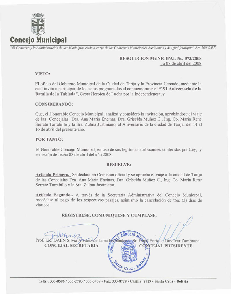 Declara en Comisión Oficial y se aprueba el viaje a la ciudad de Tarija de las Concejalas Dra. Ana María Encinas, Dra. Griselda Muñoz C. y la Ing. Co. Maria René Serrate Tarabillo y la Sra Zulma Justiniano