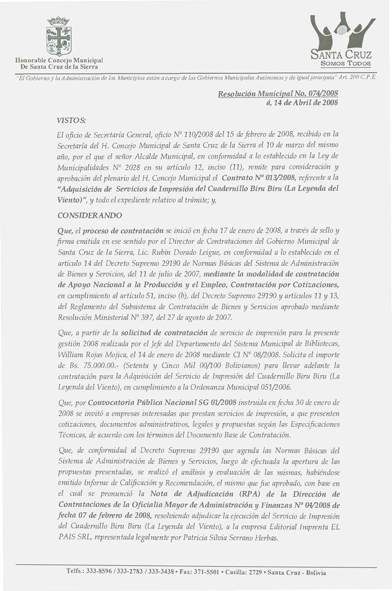 Aprueba el Contrato Nº 013/2008, referente a la “Adquisición de Servicio de Impresión del Cuadernillo Biru Biru (La Leyenda del Viento)”, para la Dirección de Cultura, Patrimonio y Turismo a través del Departamento del Sistema Municipal de Bibliotecas del Gobierno Municipal de Santa Cruz de la Sierra, por un monto de Bs. 64.200.00.- (Sesenta y Cuatro Mil Doscientos 00/100 Bolivianos).