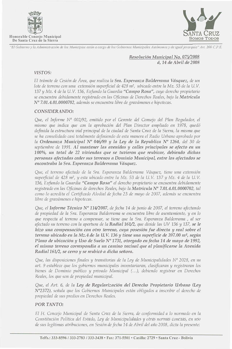 Aprueba la Minuta de Cesión de Terreno por afectación a favor del Gobierno Municipal de Santa Cruz de la Sierra, de un lote de terreno ubicado en la zona Sud Oeste de la ciudad, entre la Mz. 53 de la U.V. 137 y Mz. 4 de la U.V. 136, Barrio Campo Rosa, Ex Fundo “La Guardia”, Provincia Andrés Ibáñez del Departamento de Santa Cruz.
