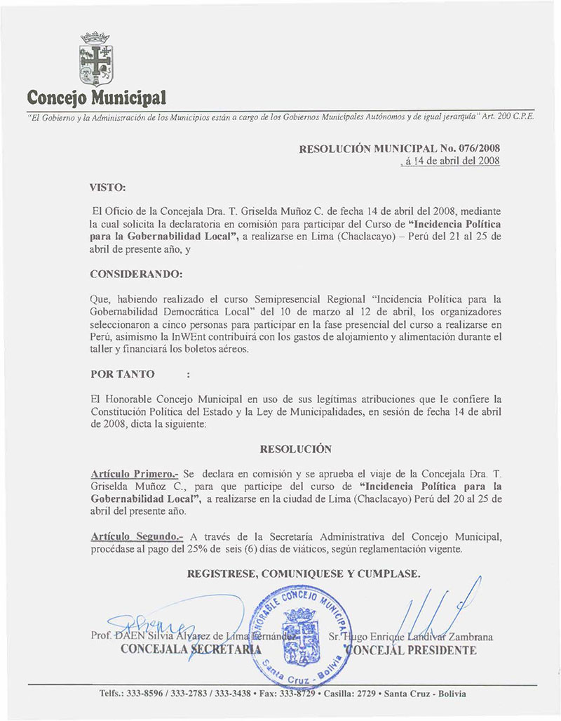 Declara en Comisión y se aprueba el viaje de la Concejala Dra. Griselda Muñoz, para que participe del curso de "Incidencia Política para la Gobernabilidad Local", a realizarse en la ciudad de Lima Perú del 20 al 25 de abril del presente año.