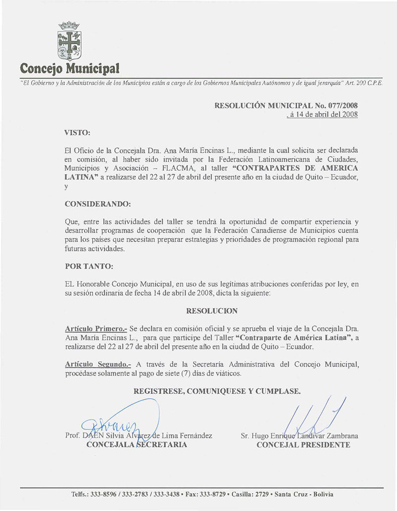 Declara en comisión oficial y se aprueba el viaje de la Concejala Dra. Ana Maria Encina, para que participe del Taller "Contraparte de América Latina", a realizarse del 22 al 27 de abril del presente año en la ciudad de Quito Ecuador.