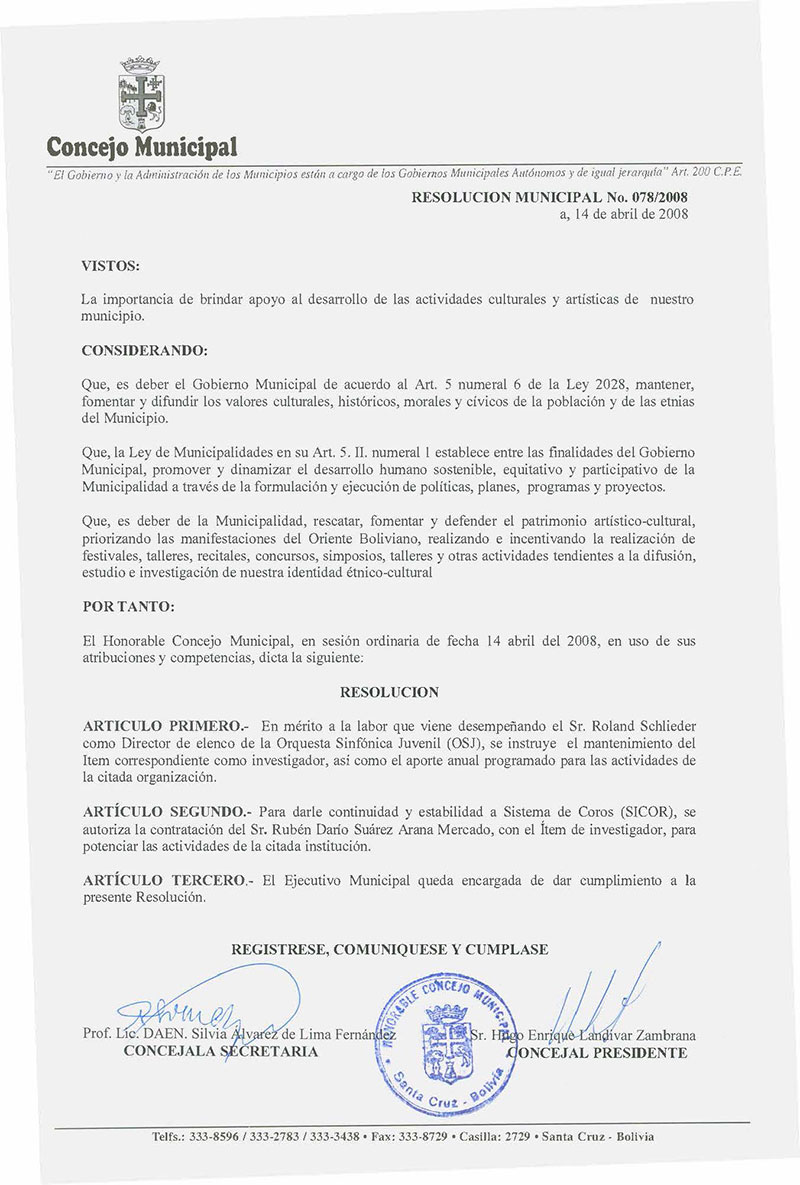 En mérito a la labor que viene desempeñando el Sr. Roland Schlieder como Director del elenco de la Orquesta Sinfónica Juvenil (OSJ), se instruye el mantenimiento del Item correspondiente como investigador, así como el aporte anual programado para las actividades de la citada organización.