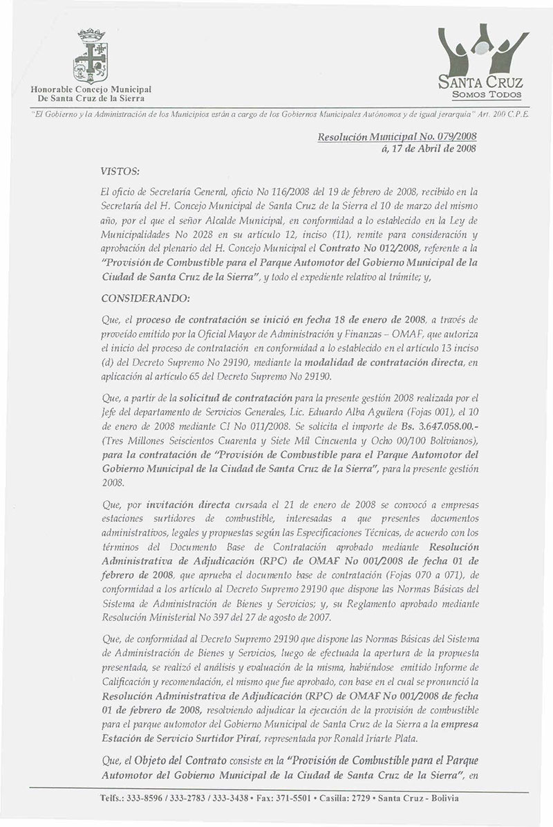 Aprueba el Contrato N° 012/2008, referente a la “Provisión de Combustible para el Parque Automotor del Gobierno Municipal de la Ciudad de Santa Cruz de la Sierra”, por un monto de Bs. 3.647.058.00.- (Tres Millones Seiscientos Cuarenta y Siete Mil Cincuenta y Ocho 00/100 Bolivianos), adjudicado a la empresa Estación de Servicio Surtidor Piraí.