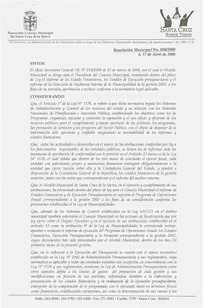 Aprueba la ejecución del Programa Anual de Operaciones, los Estados Financieros consolidados al 31 de Diciembre de 2007 y la Ejecución Presupuestaria, presentados dentro del plazo de Ley por el Ejecutivo Municipal y que se tienen en el resumen contenido en el Anexo “A” que forma parte integrante de la presente Resolución.