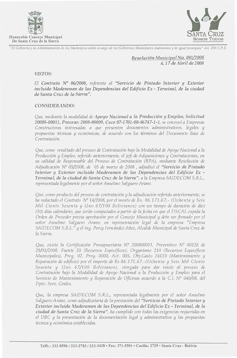 Aprueba el Contrato Nº 14/2008 de 10 de marzo 2008, por el monto de Bs 86.171.67.- (Ochenta y Seis Mil Ciento Sesenta y Uno 67/100 Bolivianos) relativo al “Servicio de Pintado Interior y Exterior Incluido Maderamen de las dependencias del Edificio Ex Terminal, suscrito con la Empresa SAIDECOM S.R.L.