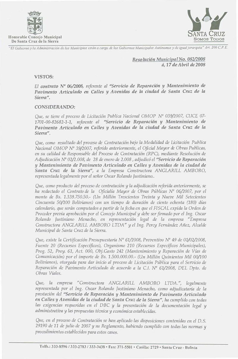 Aprueba el Contrato Nº 06/2008 de 06 de marzo 2008, por el monto de Bs 1.339.750.50.- (Un Millón Trescientos Treinta y Nueve Mil Setecientos Cincuenta 50/100 Bolivianos) relativo al “Servicio de Reparación y Mantenimiento de Pavimento Articulado en Calles y Avenidas de la ciudad de Santa Cruz de la Sierra” a suscribirse con la Empresa “Constructora ANGLARILL LTDA”.