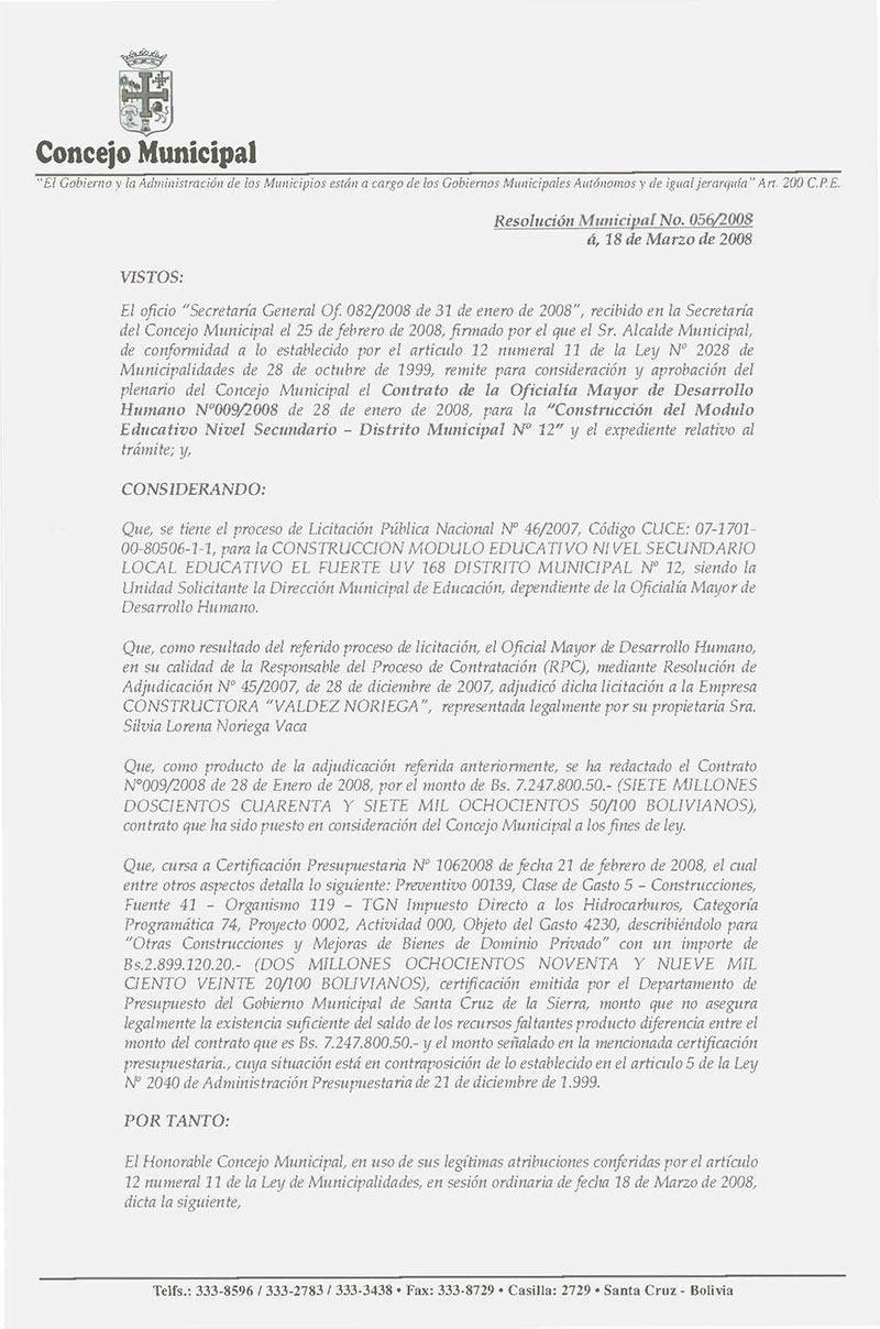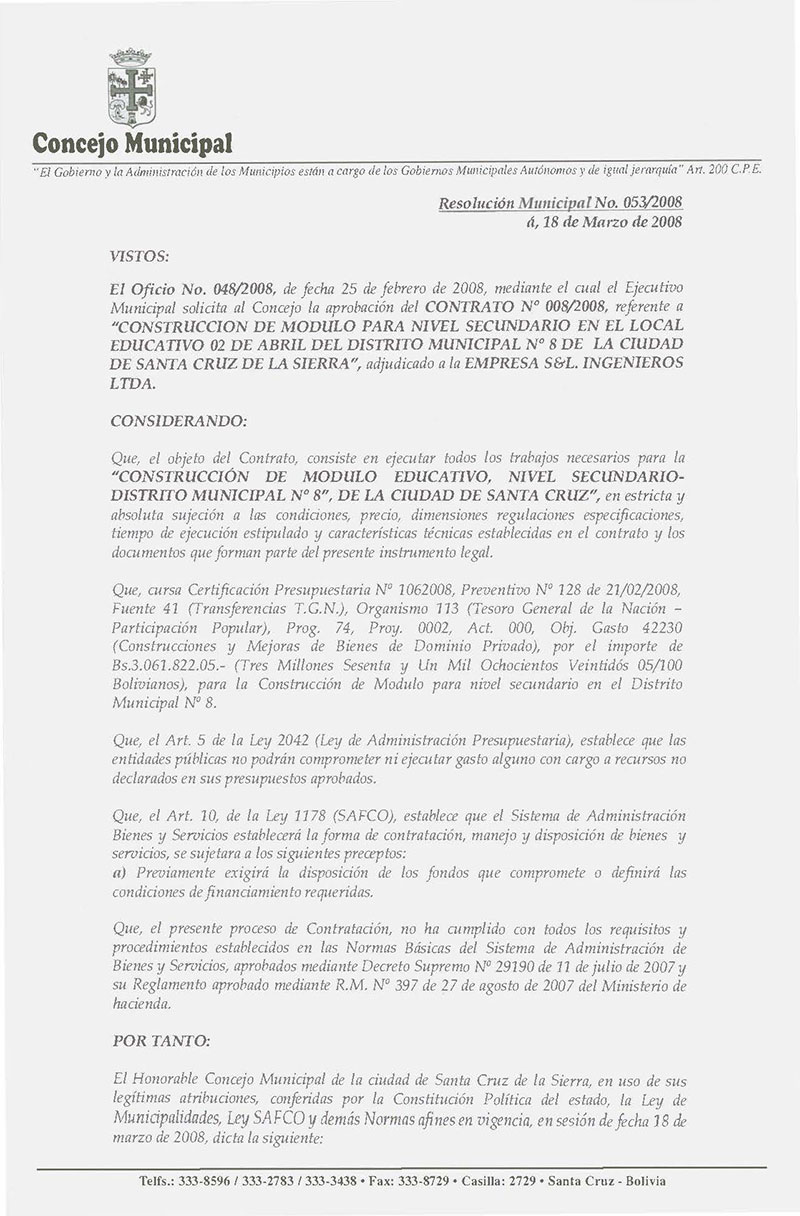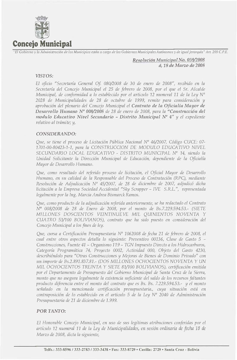 Rechaza el Contrato Nº 08/2008 de 28 de enero de 2008, referente a la construcción de “Construcción de Modulo Educativo Nivel Secundario – Distrito Municipal Nº 4 de la Ciudad de Santa Cruz de la Sierra”.