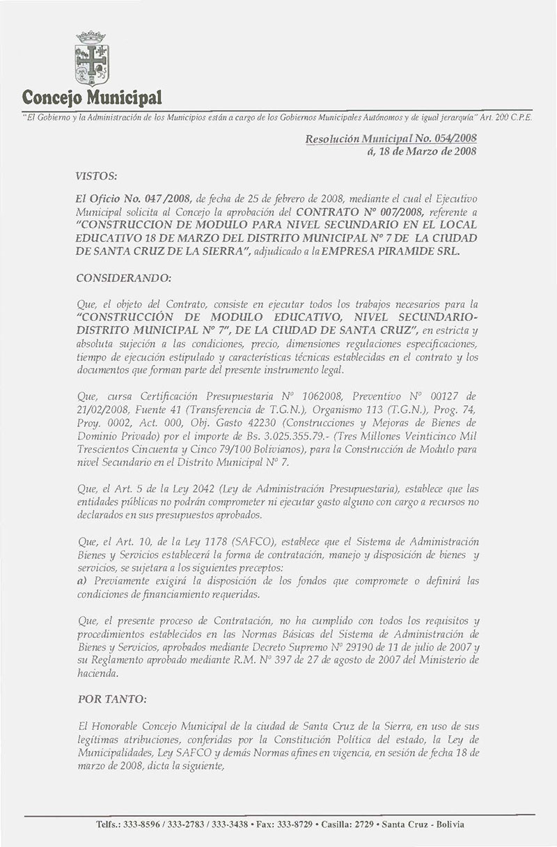 Rechaza el Contrato Nº 007/2008, referente a “CONSTRUCCION DE MODULO PARA NIVEL SECUNDARIO EN EL LOCAL EDUCATIVO 18 DE MARZO DEL DISTRITO MUNICIPAL Nº 7 DE LA CIUDAD DE SANTA CRUZ DE LA SIERRA”, adjudicado a la “EMPRESA PIRAMIDE S.R.L.”.