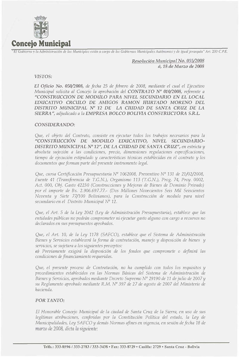 Rechaza el Contrato Nº 010/2008, referente a “CONSTRUCCION DE MODULO PARA NIVEL SECUNDARIO EN EL LOCAL EDUCATIVO CIRCULO DE AMIGOS RAMÓN HURTADO MORENO DEL DISTRITO MUNICIPAL Nº 12 DE LA CIUDAD DE SANTA CRUZ DE LA SIERRA”, adjudicado a la EMPRESA BOLCO BOLIVIA CONSTRUCTORA S.R.L.