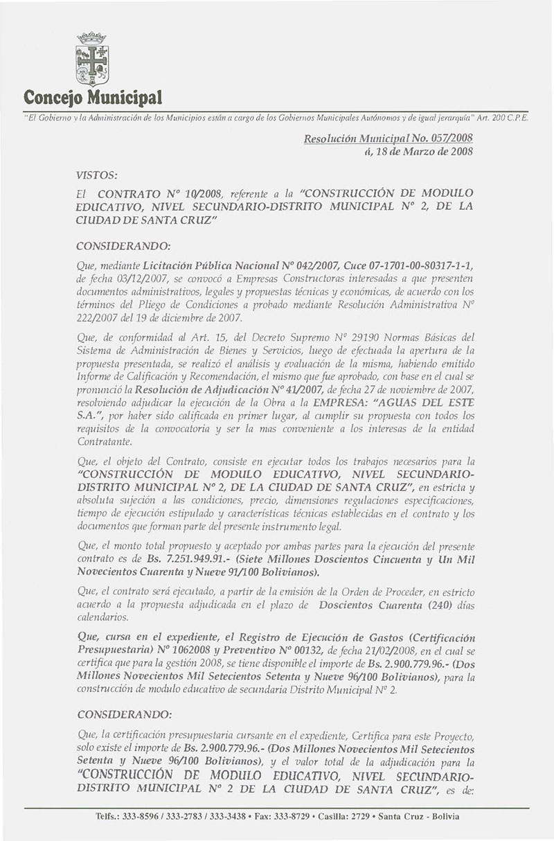 Rechaza el contrato Nº 10/2008, referente a la “CONSTRUCCIÓN DE MODULO EDUCATIVO, NIVEL SECUNDARIO-DISTRITO MUNICIPAL Nº 2, DE LA CIUDAD DE SANTA CRUZ”, adjudicado a la EMPRESA: “AGUAS DEL ESTE S.A.”.