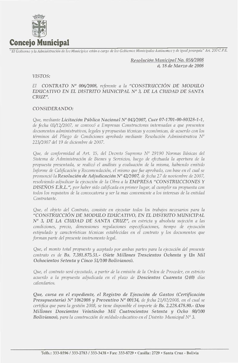 Rechaza el contrato Nº 006/2008, referente a la “CONSTRUCCIÓN DE MODULO EDUCATIVO EN EL DISTRITO MUNICIPAL Nº 3, DE LA CIUDAD DE SANTA CRUZ”, adjudicado a la EMPRESA “CONSTRUCCIONES Y DISEÑOS E.R.L.”.