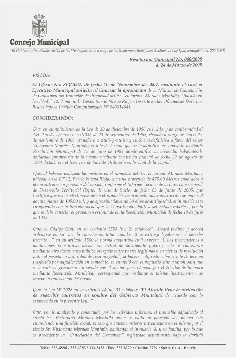 Aprueba la “Minuta de Cancelación del Gravamen” del Inmueble de Propiedad del Sr. Victoriano Morales Montaño, ubicado en la UV. ET 12, Zona Sud-Oeste, franja de equipamiento terciario Nº 12, Barrio Nueva Rioja, con una superficie de 475.00 metros cuadrados el mismo que se encuentra gravado bajo la Partida Computarizada N° 040014641 de fecha 17 de julio de 1985.