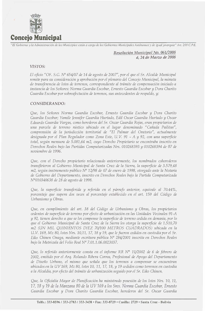 Aprueba Minuta de Transferencia en compensación de la superficie de terreno de 1.51070 m² (UN MIL QUINIENTOS DIEZ 70/100 METROS CUADRADOS), que hace el Gobierno Municipal de Santa Cruz de la Sierra a favor de los Sres.: Norma Guardia Escobar, Ernesto Guardia Escobar y Dora Charito Guardia Escobar, de los lotes de terrenos Nrs. 10, 11, 17, 18 y 19 ubicados en el Barrio “El Fuerte” de la U.V. 169, manzana 80, terrenos municipales que fueron cedidos por el Sr. Eiko Chinen.