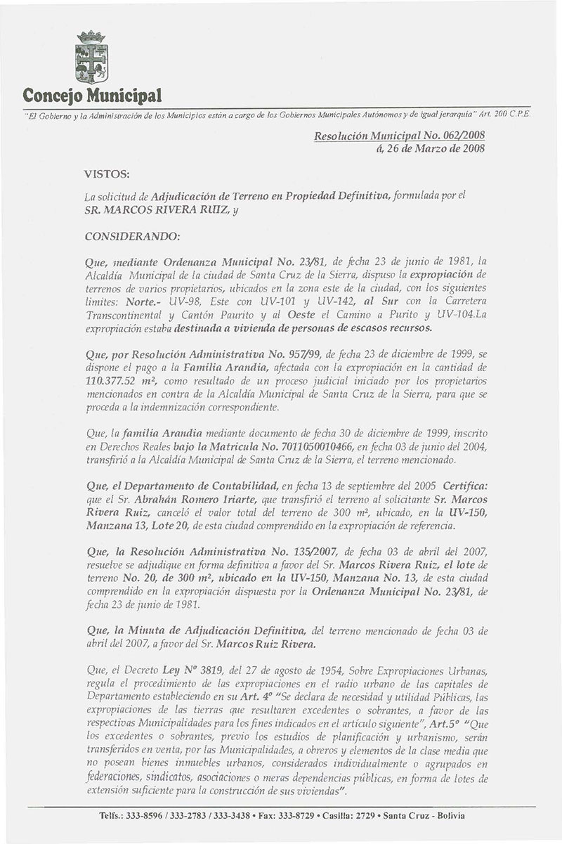 Se APRUEBE LA MINUTA DE TRANSFERENCIA DE TERRENO EN PROPIEDAD DEFINITIVA, a favor de la Sr. Marcos Rivera Ruiz, el mismo que está ubicado en el Plan 3000 en la UV-150 –Mza. 13, de esta ciudad, signado con el Nº 20, con una superficie de 300 m², y se encuentra comprendido en la expropiación dispuesta por la Ordenanza Municipal No. 23/81, de fecha 23 de junio de 1981, por haberse cancelado el valor total del terreno según certificación emitida por el Dpto. de Contabilidad de la Honorable Alcaldía Municipal de Santa Cruz de la Sierra.