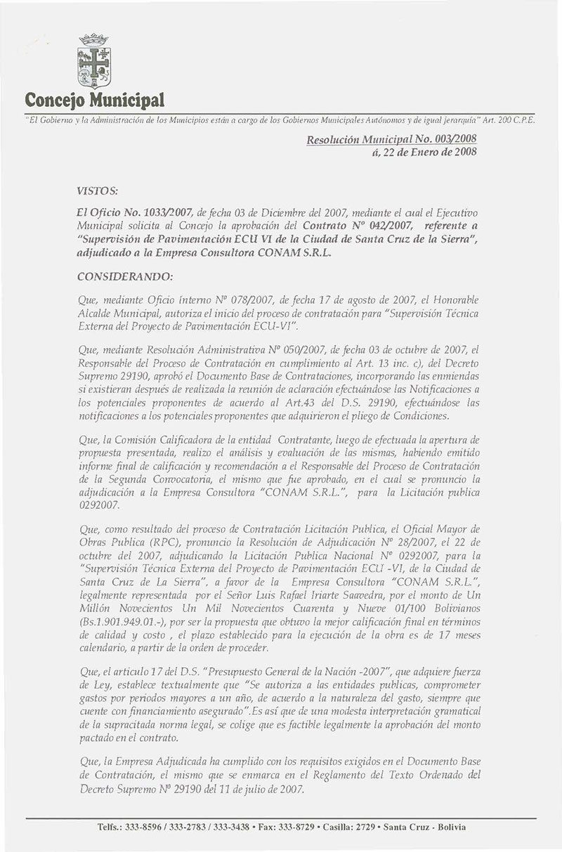 Aprueba el Contrato Nº 042/2007, referente a “Supervisión De Pavimentación ECU VI, de la Ciudad de Santa Cruz de la Sierra”, por el precio total de Bs. 1.901.949.01 (UN MILLÓN NOVECIENTOS UN MIL NOVECIENTOS CUARENTA Y NUEVE 01/100 BOLIVIANOS), adjudicado a la Empresa Consultora CONAM S.R.L.