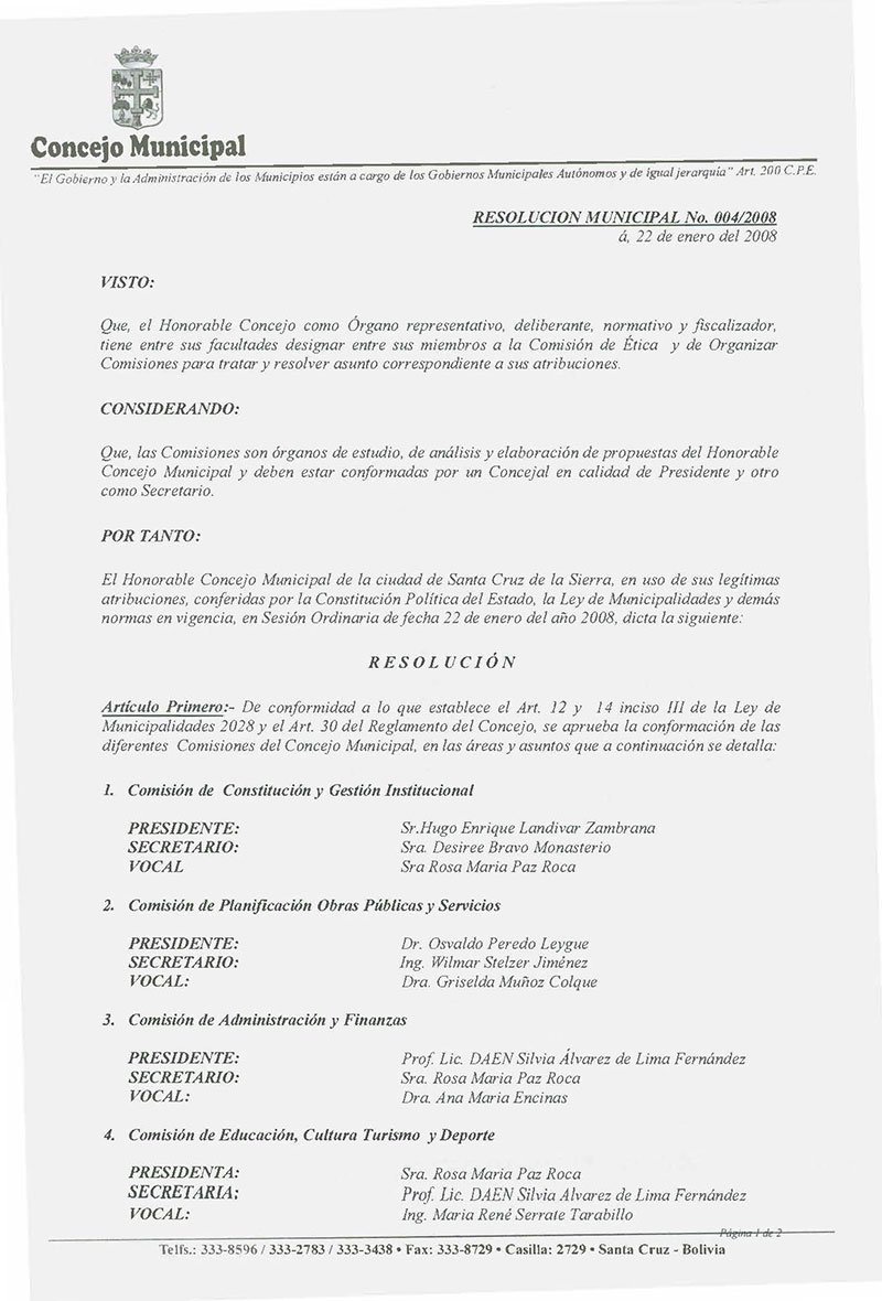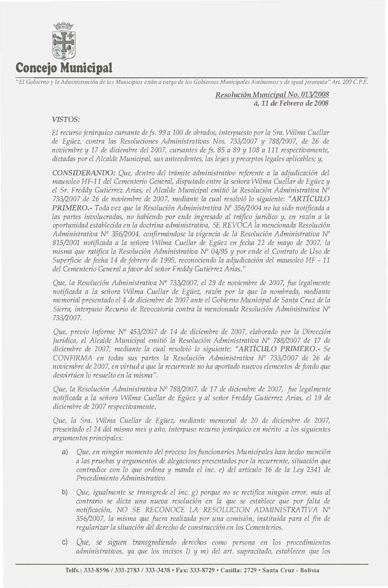 Confirmar en todas sus partes la Resolución Administrativa Nº 788/2007 de 17 de diciembre de 2007, y en su mérito la Resolución Administrativa Nº 733/2007 de 26 de noviembre de 2007, dictadas por el Alcalde Municipal, salvándose los derechos de la interesada Sra. Wilma Cuéllar de Eguez acudir a la vía legal correspondiente.