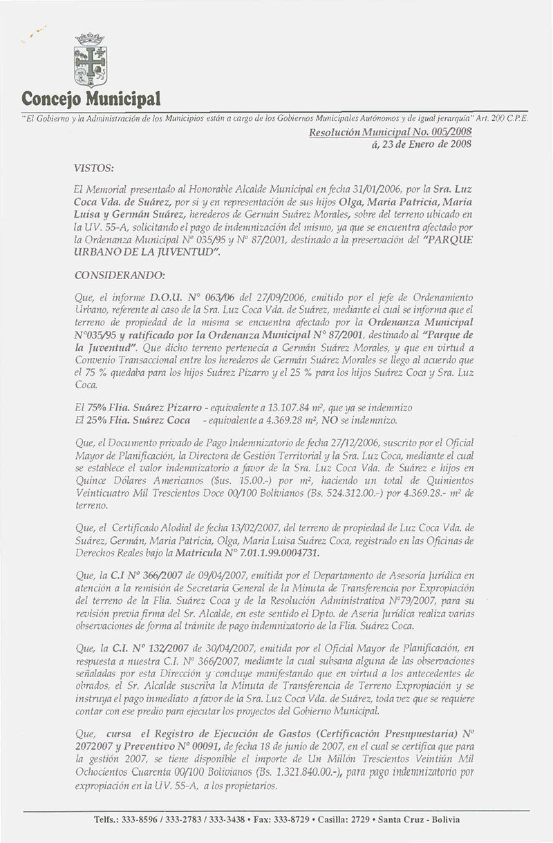 Aprueba el Contrato de Transferencia del Terreno Urbano Ubicado en la U.V. 55-A, expropiado de la Familia Suárez Coca a través de las Ordenanzas Municipales Nº 035/95 y Nº 087/2001, destinado al “Parque Urbano de la Juventud”, suscrito con la propietaria Sra. Luz Coca Vda. de Suárez.