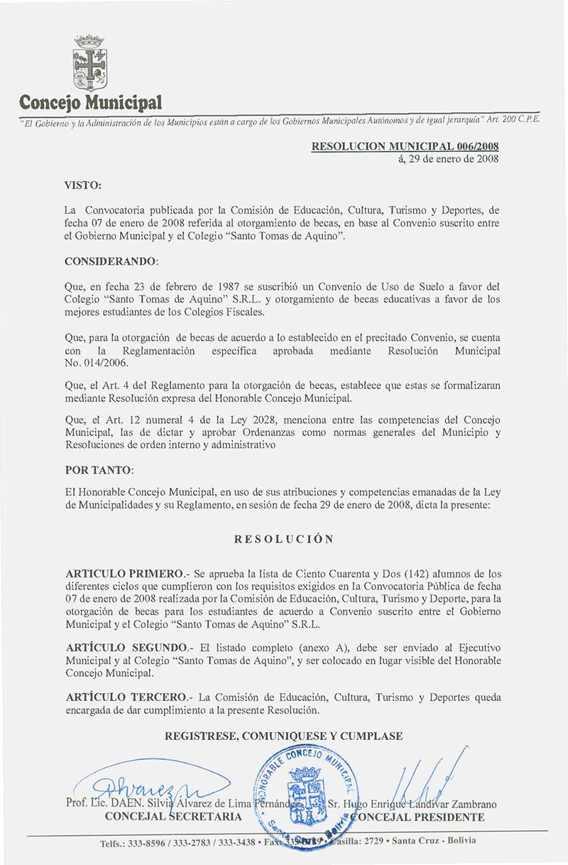 Aprueba Lista de Ciento Cuarenta y Dos (142) alumnos de los diferentes ciclos que cumplieron con los requisitos exigidos en la Convocatoria Pública de fecha 07 de enero de 2008, realizada por la Comisión de Educación, Cultura, Turismo y Deporte, para la otorgación de becas para los estudiantes de acuerdo a Convenio suscrito entre el Gobierno Municipal y el Colegio “Santo Tomas de Aquino” S.R.L.