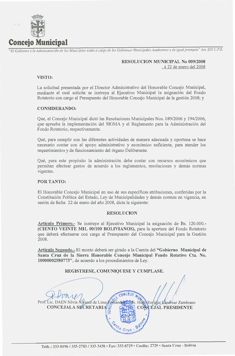 Instruye al Ejecutivo Municipal la asignación de Bs. 120.000.-(CIENTO VEINTE MIL 00/100 BOLIVIANOS), para la apertura del Fondo Rotatorio que deberá efectuarse con cargo al Presupuesto del Concejo Municipal para la Gestión 2008.