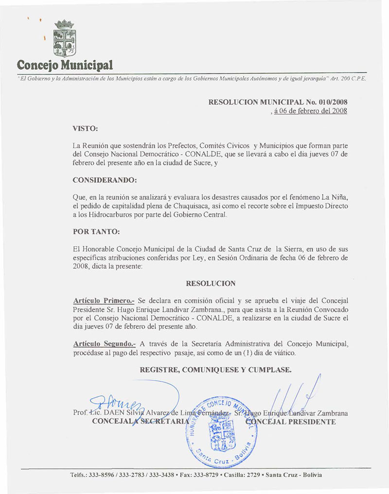 Declara en Comisión Oficial y aprueba el Viaje del Concejal Presidente Sr. Enrique Landivar Zambrana a la Reunión Convocado por el Concejo Nacional Democrático - CONALDE, a realizarse en la ciudad de Sucre el día jueves 07 de febrero del presente año.