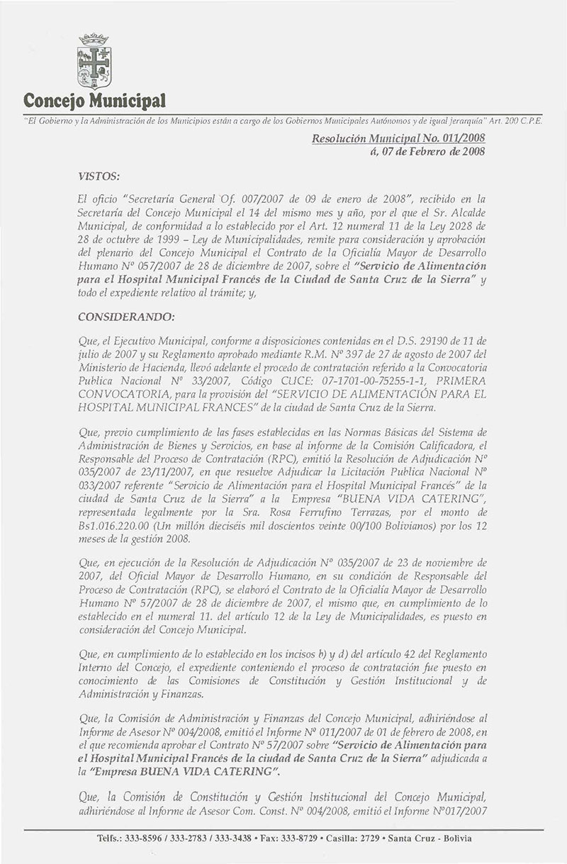Rechaza del Contrato N° 057/2007 de 28 de diciembre de 2007, por el monto total de Bs. 1.016.220.00.- (UN MILLÓN DIECISÉIS MIL, DOSCIENTOS VEINTE 00/100 BOLIVIANOS), referente al “Servicio de Alimentación para el Hospital Municipal Francés”, adjudicado a la Empresa Unipersonal "BUENA VIDA CATERING".