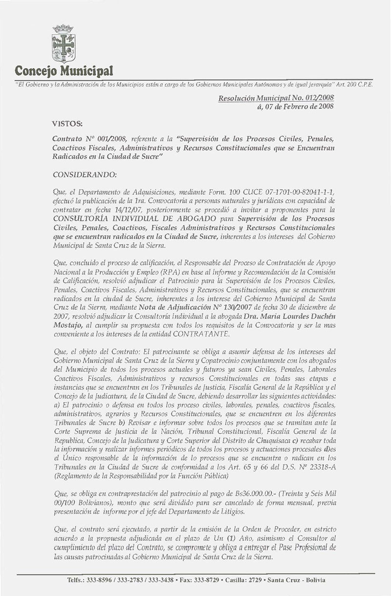 Aprueba el contrato Nº 001/2008, referente a la “Supervisión de los Procesos Civiles, Penales, Coactivos Fiscales, Administrativos y Recursos Constitucionales que se encuentran radicados en la Ciudad de Sucre”, por un monto de Bs. 36.000.00.- (Treinta y Seis Mil 00/100 Bolivianos), suscrito con la Dra. Maria Lourdes Duchén Mostajo.