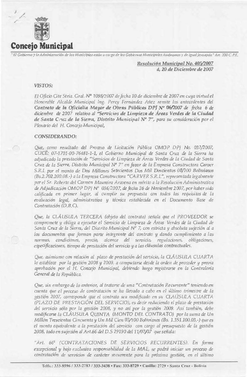 Aprueba el Contrato de la Oficialía Mayor de Obras Públicas DPJ Nº 06/2007, relativo al “Servicio de Limpieza de Áreas Verdes de la Ciudad de Santa Cruz de la Sierra, por el monto de Bs. 1.351.100.03 (Un Millón Trescientos Cincuenta y Un Mil Cien 03/100 Bolivianos).
