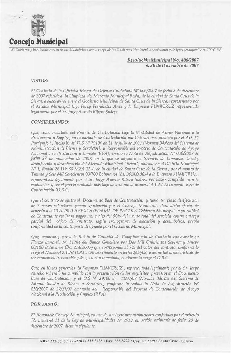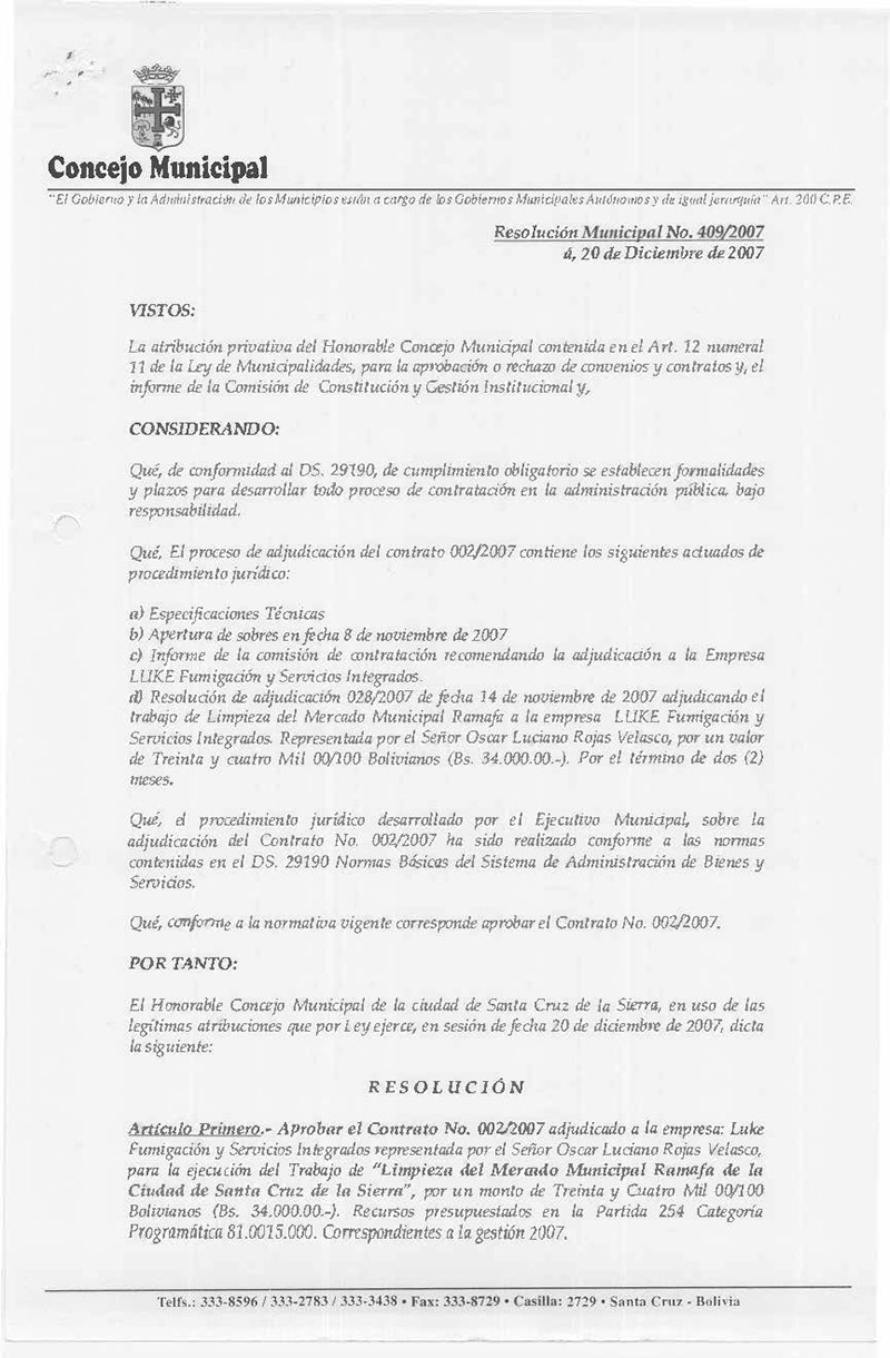 Aprueba el Contrato N° 002/2007 adjudicado a la empresa Luke Fumigación y Servicios Integrados representada por el Señor Oscar Luciano Rojas Velasco, para la ejecución del Trabajo de “Limpieza del Mercado Municipal Ramada de la Ciudad de Santa Cruz de la Sierra”, por un monto de Bs. 34.000.00 (Treinta y Cuatro Mil 00/100 Bolivianos).