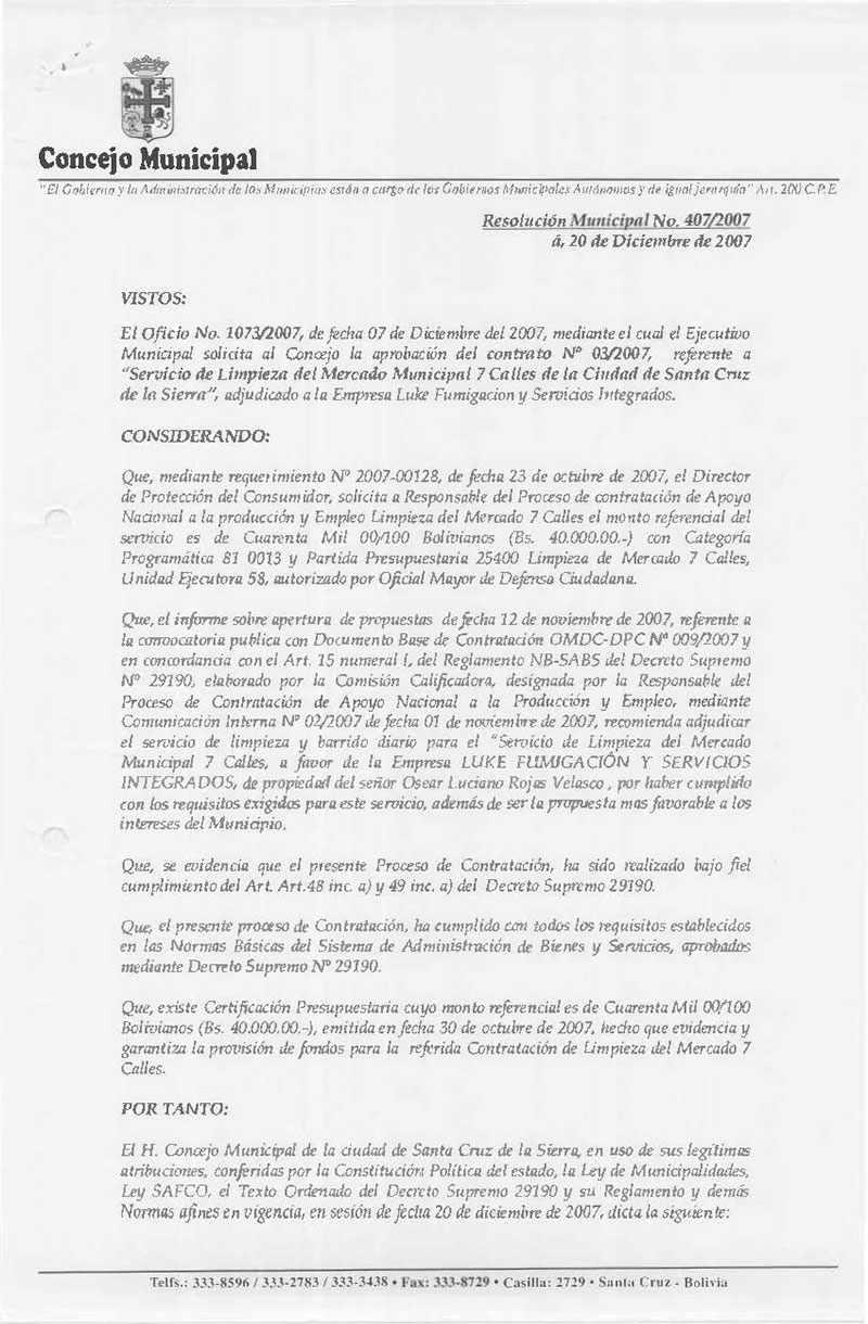 Aprueba el Contrato Nº 03/2007, referente a “Servicio de Limpieza del Mercado Municipal 7 Calles de la Ciudad de Santa Cruz de la Sierra”, adjudicado a la Empresa “Luke Fumigación y Servicios Integrados”, por el preció total de Bs. 36.000.00 (Treinta y Seis Mil 00/100 Bolivianos).