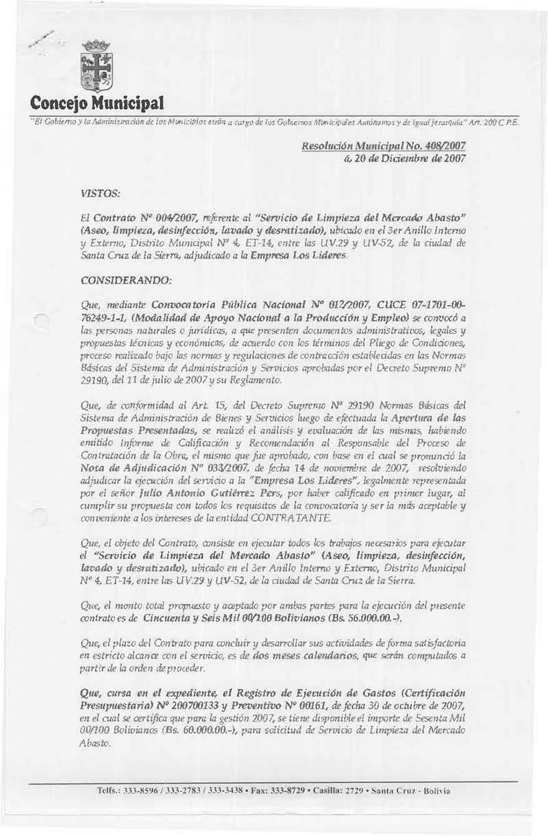 Aprueba el Contrato Nº 004/2007, referente al ““Servicio de Limpieza del Mercado Abasto” (Aseo, limpieza, desinfección, lavado y desratizado) de la ciudad de Santa Cruz de la Sierra, adjudicado a la “Empresa Los Lideres”, por el monto total de Bs. 56.000.00 (Cincuenta y Seis Mil 00/100 Bolivianos).