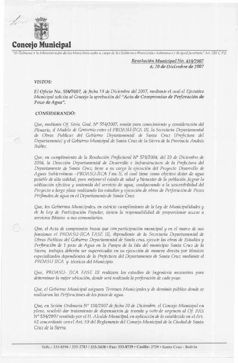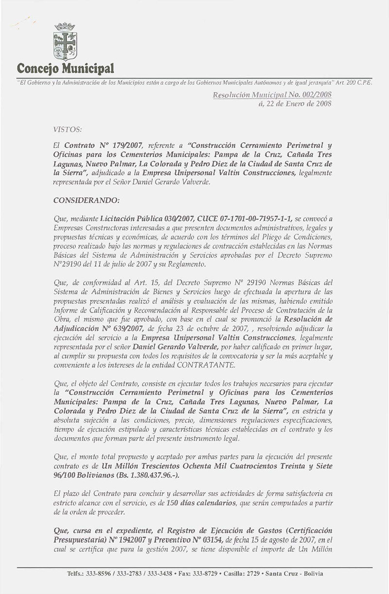 Aprueba el Contrato Nº 179/2007, referente a “Construcción Cerramiento Perimetral y Oficinas para los Cementerios Municipales Pampa de la Cruz, Cañada Tres Lagunas, Nuevo Palmar, La Colorada y Pedro Diez, adjudicado a la Empresa Unipersonal Valtin Construcciones, por un monto de Un Millón Trescientos Ochenta Mil Cuatrocientos Treinta y Siete 96/100 Bolivianos (Bs. 1.380.437.96.-).