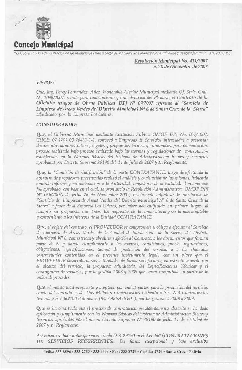 Aprueba el Contrato de la Oficialía Mayor de Obras Públicas DPJ Nº 07/2007, Nº OMOP DPJ 037/2007,solo para la gestión 2008, contratación de carácter recurrente para la prestación del “Servicio de Limpieza de Áreas Verdes del Distrito Municipal Nº 8 de Santa Cruz de la Sierra”, suscrito con la Empresa Los Lideres.