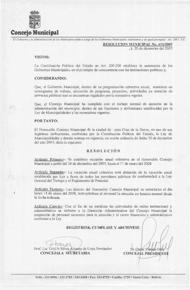 Establece Vacación Colectiva del Honorable Concejo Municipal de Santa Cruz de la Sierra desde las fechas 24 de diciembre del 2007 al 11 de enero del 2008.