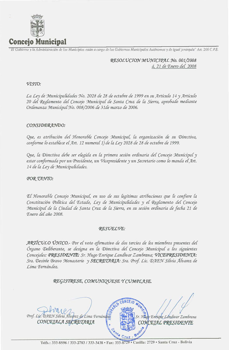Designación y Conformación de la Nueva Directiva 2008: Presidente Sr. Hugo Enrique Landivar Zambrana, Vicepresidente Sra. Desiree Bravo Monasterio y Secretaria Prof. Silvia Alvarez de Lima Fernández.