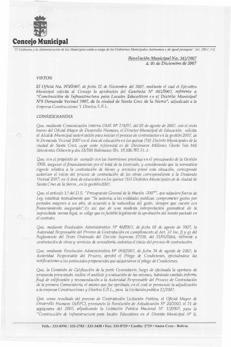 Se aprueba el Contrato Nº 041/2007, referente a “Construcción de Infraestructura para Locales Educativos en el Distrito Municipal Nº 8, Demanda Vecinal 2007 de la ciudad de Santa Cruz de la Sierra”,Adjudicada a la Empresa Construcciones y Diseños E.R.L., legalmente representada por su propietario Sr. Peter Jorge Erlwein Álvarez, por el monto total de Bs. 3.208.110.08 (Tres Millones Doscientos Ocho Mil Ciento Diez 08/100 Bolivianos).