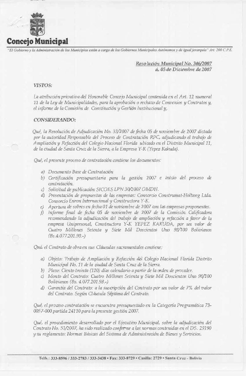 Aprueba el Contrato N° 51/2007 suscrito con la Empresa Constructora Unipersonal Y-P (YEPEZ KAKUDA) para la ejecución del Trabajo de “Ampliación y Refacción del Colegio Nacional Florida Distrito Municipal 11 de la ciudad de Santa Cruz de la Sierra” por un monto de Bs. 4.077.201.98 (Cuatro Millones Setenta y Siete Mil Doscientos Uno 98/100 Bolivianos).