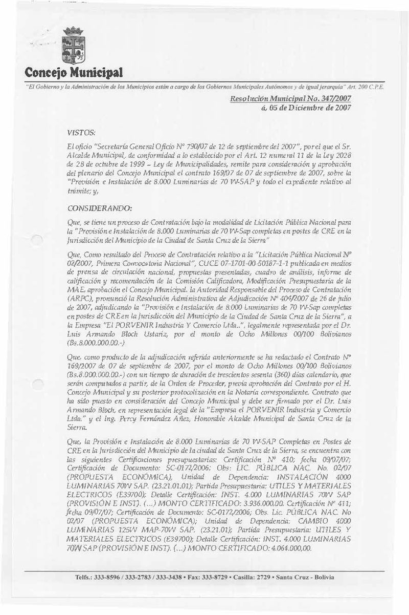 Aprueba el Contrato N° 169/2007 de 07 de septiembre 2007, por el valor de Ocho Millones 00/100 Bolivianos (Bs. 8.000.000.00) relativo a la “Provisión e Instalación de 8.000 Luminarias de 70 W-SAP completas en postes de CRE en la Jurisdicción del Municipio de la Ciudad de Santa Cruz de la Sierra” a suscribirsecon la Empresa “El PORVENIR Industria Y Comercio Ltda.”.