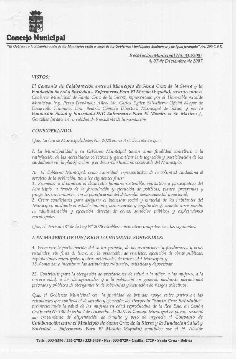 Aprueba Convenio de Colaboración entre el Gobierno Municipal de Santa Cruz de la Sierra y la Fundación Salud y Sociedad – Enfermeras Para El Mundo (España).